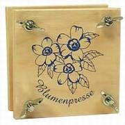 Nicht nur für Kinder ist das Spiel mit einer Blumenpresse eine empfehlenswerte Sache. Mit den gepressten Blättern und Blüten können Sie z.B. Bilder und Kalender gestalten oder einen individuellen Pflanzenführer herstellen. Die Pflanzenpresse wurde aus Birkensperrholz gefertigt, mit 4 Spannschrauben wird zwischen wellpappe und Fließpapier gepresst. Maße: 9 x 9 x 5 cm