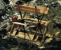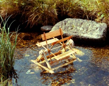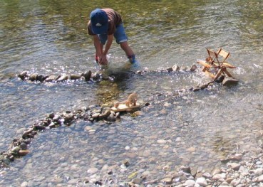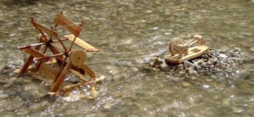 Das Flussrad wird mit Steinen auf seinem Gestell im Bach beschwert. So kann das Wasser über die ganze Breite seine Kraft an das Mühlrad abgeben. Damit lässt sich sogar die Körbchenseilbahn oder das Riesenrad antreiben.
