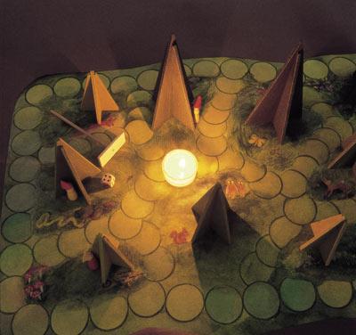 Die Zwerge meiden die Schatten im  Wald und springen über das Feuer.  Das Licht bleibt an seinem Ort stehen. Die Zwerge müssen durch den  Schatten wandern und über das Feuer springen. Wer im Schatten stehen  bleibt, wartet bis ihm ein Mitspieler einen Lichtstrahl zuspiegelt und  ihm damit weiterhilft. Das Spiel ist beendet, wenn alle Zwerge heil  nach Hause gekommen sind.