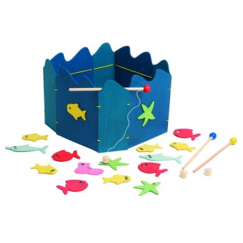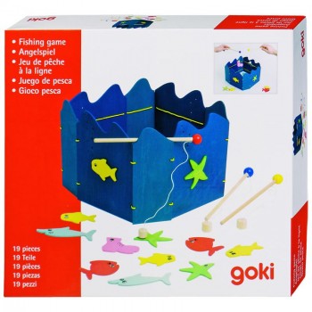 Dieser Spiele-Klassiker ist ein mitwachsendes Spiel, das eine Familie durch viele Jahre begleitet. Geduld und Geschicklichkeit sind beim Angelspiel gefordert. Um so grösser die Freude und die Belohnung für die Mühe, wenn endlich ein Fisch angebissen hat! Bei diesem Spiel sind die Fische aus Holz. Geangelt wird mit starken Magneten. Ältere Kinder können die Punktzahlen zusammenrechnen.