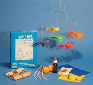 In dem reichlich bebilderten Anleitungsheft sind die entsprechenden Erscheinungen nebeneinander in Wasser und Luft beschrieben. Mit Farbstoff, Räucherkerzen, Tischtennisbällen, Sand, einem Wirbelmobile, einem Gummiband-Schaufelradboot, mit Strohhalmen kanalisierter Luft und vielem anderen kommt man den schnelllebigen Wirbeln auf die Spur. Es entstehen Wellen, Widerstand und Sog, Wirbelringe und -straßen, Kreiswirbel und sogar Wirbeltrichter.