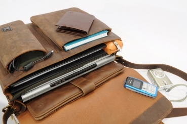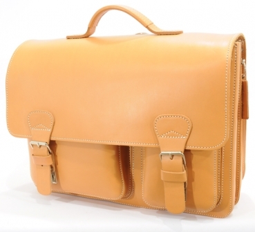Da passen auch Leitz-Ordner rein! Zwei tiefe Hauptfächer und ein flacheres Reißverschlussfach bieten reichlich Platz für Unterrichtsmaterial oder Stapel von Klassenarbeiten. Besonders reizvoll sind die asymmetrisch aufgesetzten Fronttaschen unterschiedlicher Breite. Der Schulterriemen ist in der Länge verstellbar. Der Tragegriff ist durch verstärkte Halterung besonders stabil. Es handelt sich hier um das naturfarbene Modell, im zweiten Bild ist das gebeizte zu sehen.