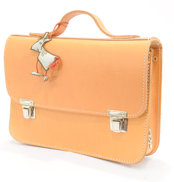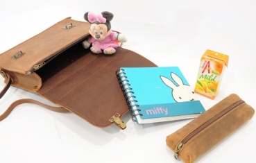Dieser Ranzen ist besonders für Schulanfänger und die ersten Schuljahre geeignet. Mit 27 x 19 x 6 cm hat er noch nicht solche Ausmaße wie die für kleinere Kinder oft zu großen üblichen Schultaschen. Und die abgerundete, harmonische Form ist eine kindgerechte Alternative zu den modernen Techno-Tornistern. Die Tasche hat ein großes Hauptfach sowie zwei flachere, davon eines mit Reißverschluss. Mit zwei Metallschnappverschlüssen ist sie einfach zu schließen und wieder zu öffnen. Die Rückentrageriemen sind abnehmbar, längenverstellbar und mitzwei Karabinerhaken und zwei Schnallen befestigt. Der Tragegriff ist in der Halterung verstärkt.