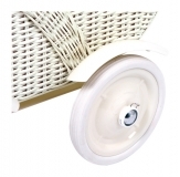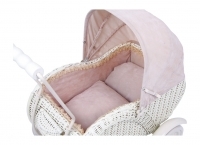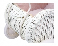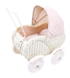 Ein schöner Puppenwagen aus weißem Korbgeflecht mit Stoffhimmel.