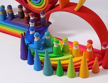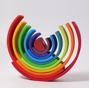 Der Regenbogen kann zum Stapeln, als Tunnel, als Bauklötze und vieles mehr verwendet werden. Wunderbar kann er auch mit dem Bausatz "Blümchen" oder allen anderen Bauklötzen von Grimms oder anderen Herstellern wie Glückskäfer, Ostheimer oder Kinderkram kombiniert werden. Die Bögen sind alle einzeln von Hand geschliffen.