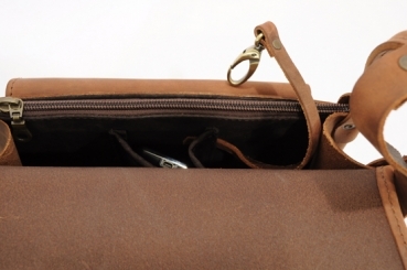 Das große Hauptfach hat eine Handytasche. Dann gibt es ein kleineres Fach mit Reißverschluß für Fahrkarten, Visitenkarten und ähnliches. In dem großen Vorderfach haben Sie die Möglichkeit, Ihre Kleinutensilien übersichtlich zu verstauen.
