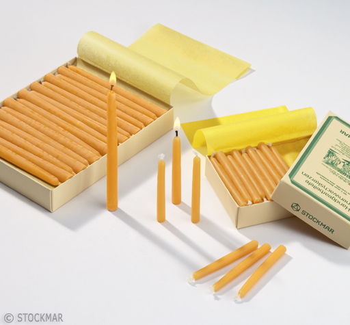 Stockmar Bienenwachskerzen bestehen aus natürlichem Bienenwachs. Es kann je nach Herkunftsland sandfarben bis gelbbraun sein. Bienenwachs hat von Natur aus einen leichten Seidenglanz und einen feinen Duft. Echte Bienenwachskerzen duften erst richtig, wenn sie angezündet sind. Der weißliche "Raureif", der bei längerer Lagerung auf den Kerzen entstehen kann, ist nur ein Qualitätsbeweis für unverfälschtes Bienenwachs, er lässt sich mit einem weichen Tuch leicht wegpolieren. Stockmar Bienenwachskerzen werden von Hand gefertigt; bei Stockmar wird das alte Handwerk, Kerzen im Tauchverfahren zu ziehen, immer noch gepflegt.