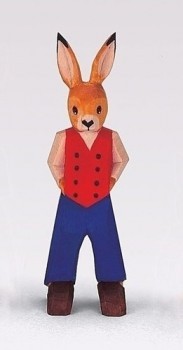 Der Hase ist aus Lindenholz handgeschnitzt und mit Ölfarben bemalt.