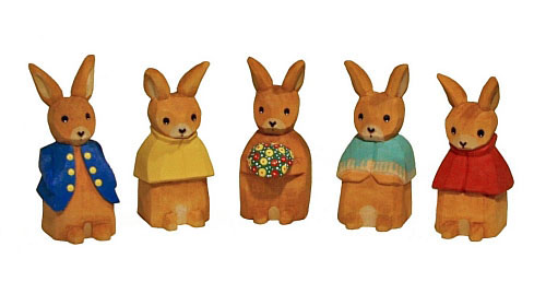 Die Häschen sind aus Lindenholz handgeschnitzt und mit Ölfarben bemalt.