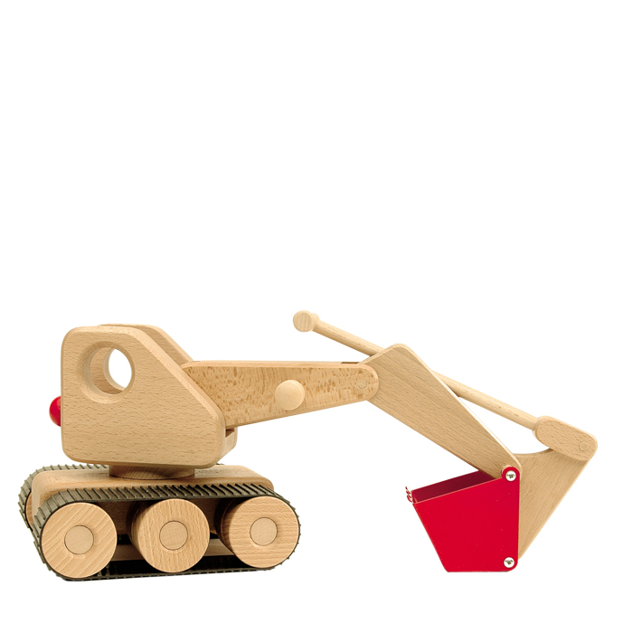 Insofern wünschen sich Kinder die wichtigen Funktionen der Fahrzeuge aus der großen Welt auch in der kleinen. Die hier angebotenen Fahrzeuge können alles Notwendige sehr gut, ohne das Kind zum reinen Bediener technischer Prozesse zu degradieren. So bleibt es aktiv und macht alles selbst, anstatt die Maschinen machen zu lassen und in die dem Spiel so abträgliche, passive Bedienung gedrängt zu werden. Geräusche werden selbst gemacht, es wird die Schaufel bedient und der Arm geschwenkt wie auch das Fahrzeug geschoben. Und wenn es ein Püppchen dazu gibt, oder eine einfache Holzfigur, kann diese sogar, durch das Kind, sprechen.
