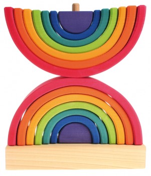 Der Regenbogen Steckturm ist ein vielseitiges Spielzeug: es können Farben, Formen und Größen sortiert, kann gestapelt und gebaut werden. So wird die Motorik der Kleinen geschult. Später können die Bögen auch als Tunnel, Dach, Turm oder Zaun dienen und auf dem Steckdübel können neue Formen gefunden und Skulpturen gesteckt werden. Schauen Sie zu, wie Ihr Kind immer neue Formen findet damit zu spielen!