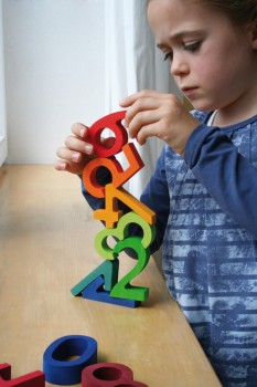 Schon für die kleinsten Kinder, die die Zahlen noch nicht kennen, gibt es mit diesem Bauset viel zu entdecken: So kann nach Herzenslust gestapelt und gebaut werden, die Formen der Zahlen werden vertraut und so ganz nebenbei wird die Motorik geschult. Wenn die Kinder mit der Welt der Zahlen in Berührung kommen, wenn sie begreifen wollen, was und wieviel z.B. 5 sind, wie die Zahl aussieht und geformt ist, sind diese großen Holzzahlen zum anfassen genau das richtige Sinnesmaterial. Nach und nach können dann auch einzelne Zahlen benannt und wiedererkannt werden. Danach eröffnet sich ein breites Spielfeld, das es im Zahlenraum bis 10 zu entdecken gilt: absteigende oder aufsteigende Reihen und Türme. Später können auch zweistellige Zahlen gelegt oder auch Rechentürme gestapelt werden. Dabei wird eine beliebige Anzahl an Zahlen aufeinandergestapelt und die Kinder können unterschiedliche Additions- oder Subtraktionsaufgaben dazu finden und dann auch das Ergebnis errechnen. Mit dem Bauset lassen sich auch drei- und vierstellige Zahlen legen und lesen. Das Bauset beinhaltet viele Spielideen, auch für ältere Kinder, zum spielerischen entdecken der Mathematik. Das Bauset Zahlen kann mit den anderen Rechenmaterialien wie den Figuren zum Zählen und Erzählen (03070), der bunten Perlentreppe (10234), den Stufenzählstäben (42100), dem Steckspiel Zahlen (11061), sowie den 5 Freunden zum Rechnen (10582) kombiniert werden, sind farblich und inhaltlich perfekt aufeinander abgestimmt und ergänzen sich wunderbar.