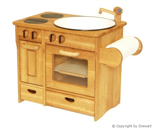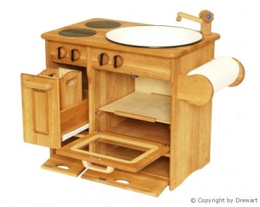 Es kann auf zwei Platten gekocht und im Ofen gebacken werden. Das Backblech läßt sich herausnehmen, die Knöpfe lassen sich drehen. Die Küche ist ausgesprochen stabil und sorgfältig verarbeitet, man kann sie nach dem Gebrauch gleich für die Enkel auf den Boden schaffen.