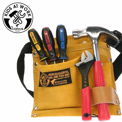 Das eigene Werkzeug an einem Werkzeuggürtel zu tragen ist nicht nur praktisch, es macht förmlich stärker und größer! Der Gürtel wird um die Taile gegurtet, er ist bestückt mit einem Hammer, einem Holländer und drei Schraubenziehern.