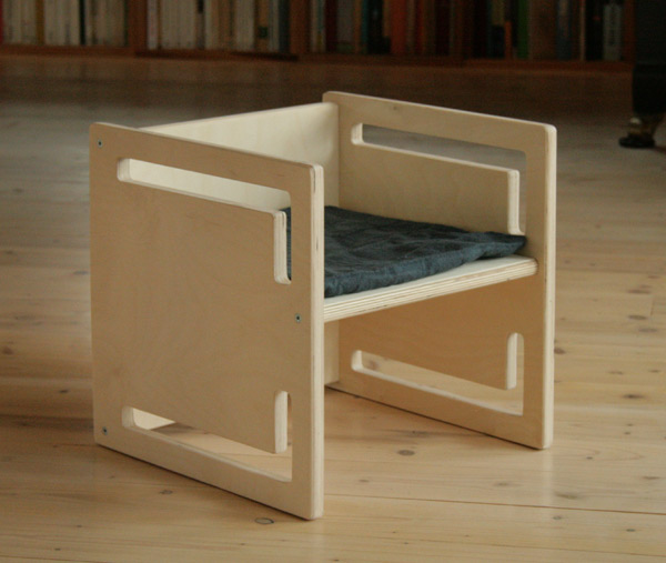 Der Stuhl hat drei verschiedene Sitzhöhen: 17,5 cm; 22,5 cm und 35 cm. Er kann so in unterschiedlichen Situationen verwendet werden und wächst mit dem Kind mit.