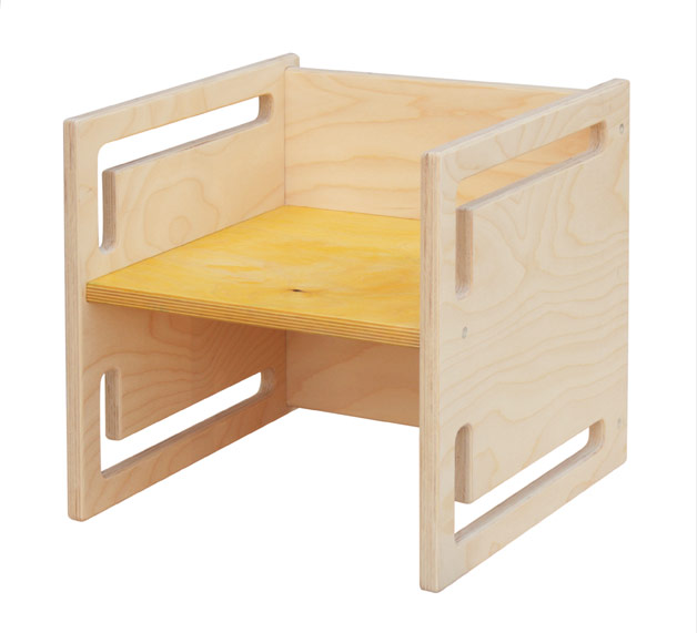 Der Stuhl hat drei verschiedene Sitzhöhen: 17,5 cm; 22,5 cm und 35 cm. Er kann so in unterschiedlichen Situationen verwendet werden und wächst mit dem Kind mit.